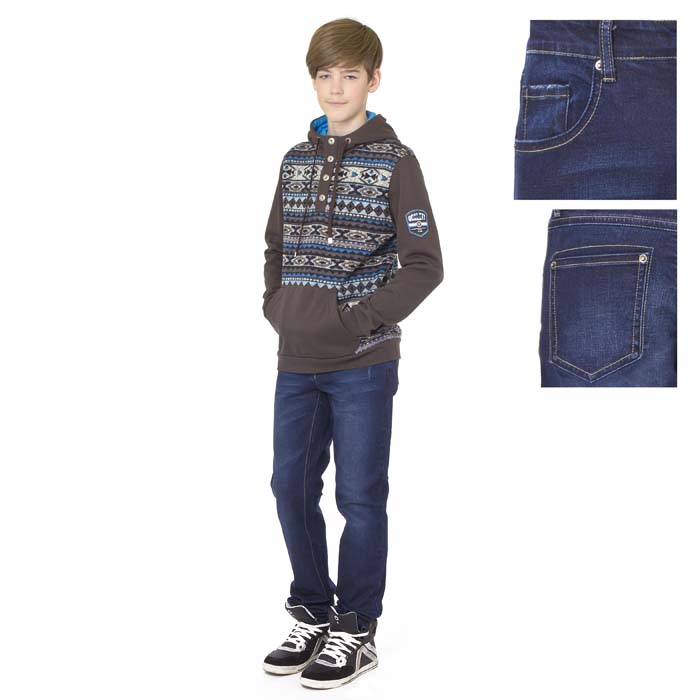 Джинсы для мальчика тёмно-синего цвета. Силуэт REGULAR. На передних половинках боковые карманы и часовой. На задних половинках кокетки и два накладных кармана. В пояс проложена регулируемая резинка.
