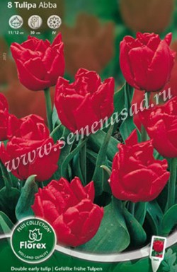Абба - тюльпан насыщенно красного цвета с темной полосой на спинке, лепестки заострённые. Высота бокала до 6 см, диаметр цветка в раскрытом виде может достигать 10см!