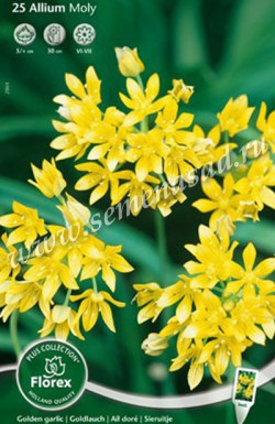Моли - время цветения приходится на июнь и продолжается в течении 2-3 недель, радуя Вас своими ароматными маленькими звездчатыми цветочками лимонно-желтого оттенка с заостренными лепестками и длинными тычинками, собранные в пышное шаровидное соцветие диаметром до 8 см. Возвышается на крупном и прочном цветоносе высотою 30 см, листья прикорневые, блестящие, плоские с ярко выраженной прожилкой по середине листа. Особенность лука Молли в том, что листья отмирают еще во время цветения, а соцветия сохраняют свою декоративность до самой осени. Лук Молли обычно высаживают на передних планах, для набольшего эффекта клубы, шикарно смотрится в групповой посадке низкорослых луков.