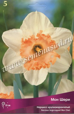 Мон Шери - высота растения 35 см, цветок кремовый с лососевой коронкой.