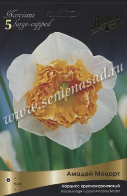 Амадей Моцарт - высота растения 45 см, цветок белый с гофрированной оранжево-красной коронкой.