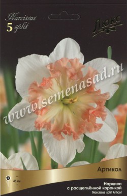 Артикол - высота растения 45 см, цветок белый с лососевой гофрированной коронкой.