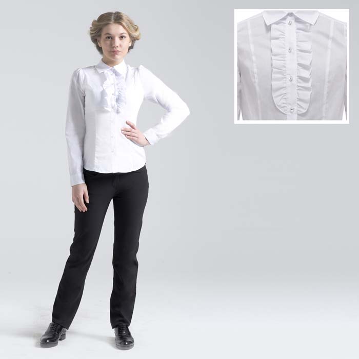 Батник для девочки из текстиля белого цвета. Длинный рукав на притачном манжете с застёжкой на пуговицы. По окату рукава заложены глубокие складки. Рубашечный воротник. Застёжка полочек на пуговицы. На полочке по планке воланы. Полочка и спинка с рельефами