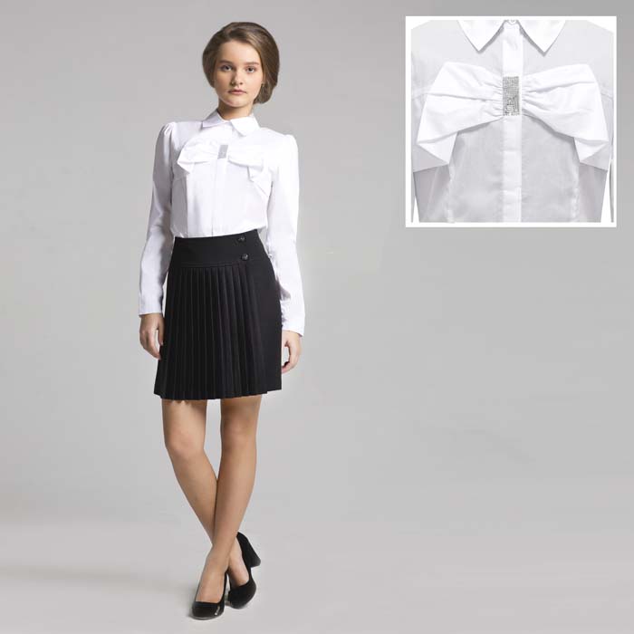 Батник для девочки из текстиля белого цвета. Приталенного силуэта. Длинный рукав на притачном манжете. По окату рукава заложены складки. Рубашечный воротник. Застёжка полочек на пуговицы. На полочке декор бант. На полочке и спинке рельефы.