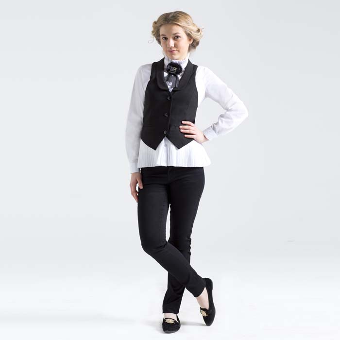 Жилет для девочки из текстиля черного цвета, на подкладке. "У" образный вырез горловины. На полочке и спинке рельефы. На спинке в рельефных швах вшит хлястик. На полочке боковые карманы. Воротник шалька. Застёжка на пуговицы