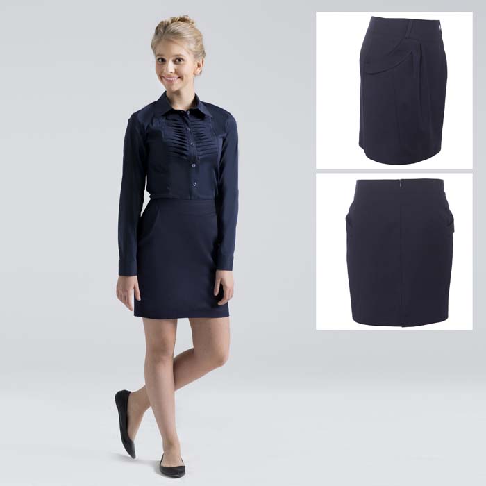 Юбка для девочки из текстиля тёмно-синего цвета, на подкладке. На передней половинке карманы и складки. В пояс проложена резинка. На задних половинках застёжка молния и разрез.