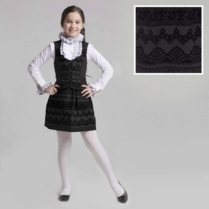 Юбка для девочки из ткани черного цвета с бархатным рисунком.Длина на 7см выше колена.Силуэт расширенный.Пояс из готовой резинки.