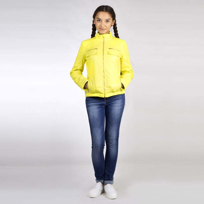 Куртка для девочки из искусственной кожи жёлтого цвета. Утеплённая на холофайбере 200гр/м2. Силуэт SLIM. Длина стандартная. На молнии, на текстильной подкладке. Нижние боковые карманы на молнии, верхние карманы накладные. Воротник- невысокая стойка. На полочках и спинке рельефные швы