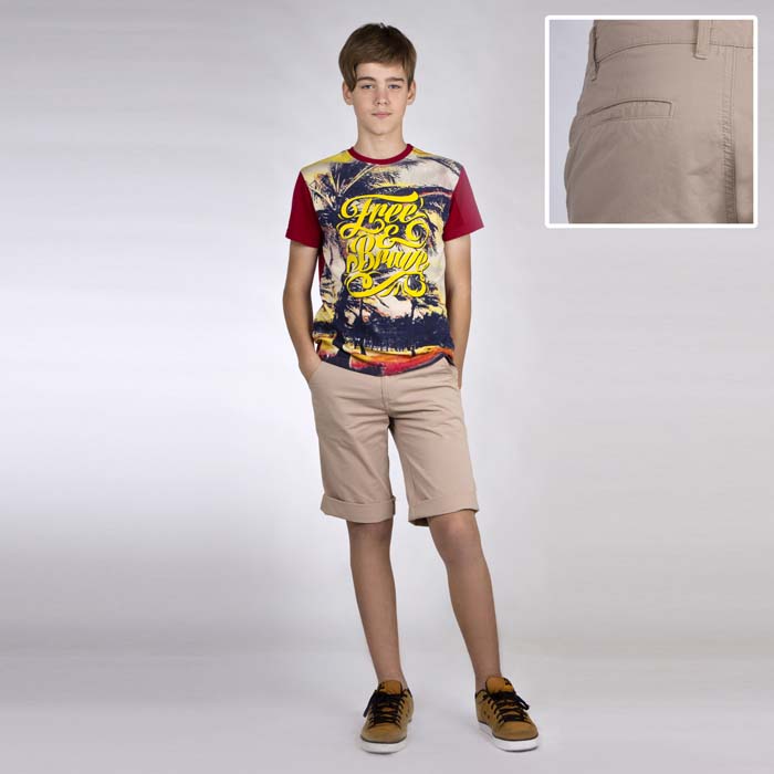 Шорты для мальчика из текстиля бежевого цвета. Длина чуть ниже колена. Силуэт COMFORT. В пояс проложена регулируемая резинка