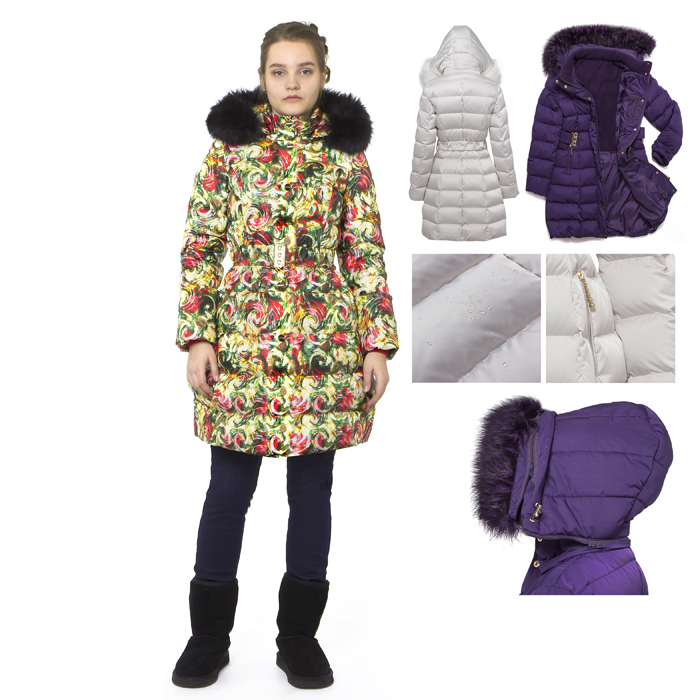 Пальто для девочки на зиму из плотной курточной ткани с водоотталкивающей пропиткой, с разноцветным принтом красно/жёлтые цветы. Подкладка выполнена с деталями флиса для утепления. Пальто до линии выше колена , прилегающего силуэта . Наполнитель шелтер с плотностью 300гр. На полочке и спинке рельефы . Внутренний манжет рукавов на резинке. Высокий воротник утепленный с внутренней стороны флисом с застежкой на две кнопки. Пальто со съемным капюшоном. В капюшон продета регулируемая резинка с фиксаторами . Мех на капюшоне съемный. Застёжка полочек на молнию с внешней ветрозащитной планкой-пластроном с застежкой кнопки . На полочке два прорезных боковых кармана на молнии. Пальто с поясом-резинка на металлической пряжке. По бокам пальто на талии шлевки для пояса. На левой полочке внутренней части потайной карман на молнии. Низ пальто регулируется резинкой с фиксаторами .