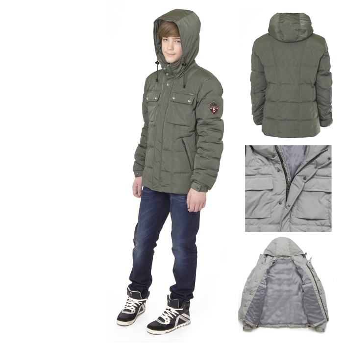 Куртка для мальчика на осень из плотной курточной ткани с водоотталкивающей пропиткой, цвета хаки. Силуэт прямой с длинной до подъягодичной складки . Наполнитель- 80% пух 20%перо. Подкладка текстильная. Застежка куртки на молнию с внутренней ветрозащитной планкой пластроном, и внешним клапаном с застёжкой на кнопки. Длинный рукав на притачном манжете с застёжкой на кнопки. Манжет на резинке. С капюшоном, в капюшон продет шнур с фиксаторами. Воротник высокий. На полочке прорезные боковые карманы на молнии с листочкой, и два верхних накладных кармана с клапанами, с застёжкой на кнопки. Два внутренний кармана на подкладке полочек. По низу куртки продета шляпная резинка с фиксаторами. На левом рукаве шеврон с вышивкой