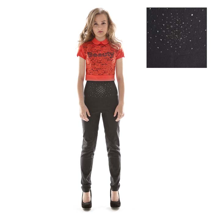 Брюки для девочки из текстиля с жаккардовым рисунком, чёрного цвета. Силуэт SLIM. Длина с завышенной талией. Широкий пояс. По боку потайная застёжка молния