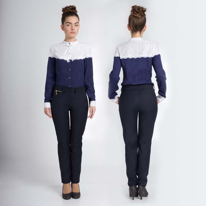 Брюки для девочки из текстиля тёмно-синего цвета. Силуэт SLIM. Посадка стандартная. На передних половинках боковые карманы, на задних половинках кокетки. На правой передней половинке декоративный вход в карман на молнии