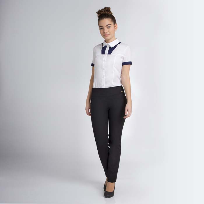 Батник для девочки из текстиля белого цвета. Длина стандартная. Силуэт полуприлегающий. Рельефы полочек и спинки, кокетки. Застёжка планка полочки на пуговицы. Притачные манжеты и вставки полочек из текстиля контрастного цвета
