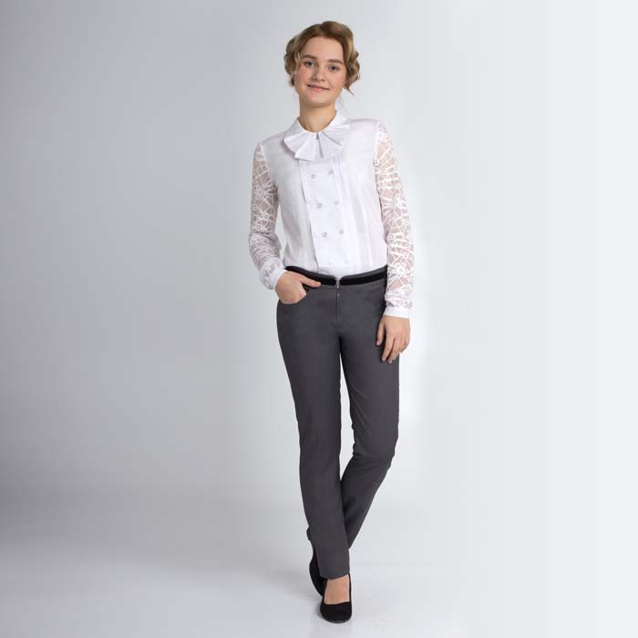 Батник для девочки из текстиля белого цвета. Длина стандартная. Силуэт прямой. На полочке грудовые вытачки. Рукава из трикотажного кружева. Застёжка полочек на пуговицы