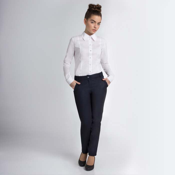 Батник для девочки из текстиля белого цвета. Силуэт полуприлегающий. Длина стандартная. Рукав на притачном манжете с застёжкой на пуговицу. Классический воротник. Рельефы полочек и спинки. Застёжка планка полочек на пуговицы