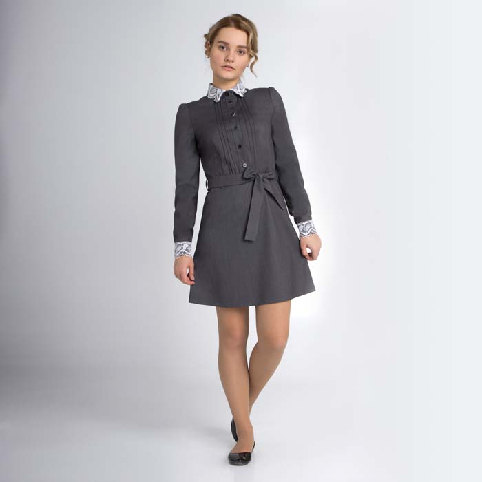 Платье для девочки из текстиля серого цвета.Длина на 7см выше линии колена. Силуэт расширенный. Отрезное по талии. Длинный рукав на манжете с пуговицей. Воротник отложной на стойке.З астежка на пуговицы до линии талии. На полочке и спинке талевые вытачки. Платье с поясом