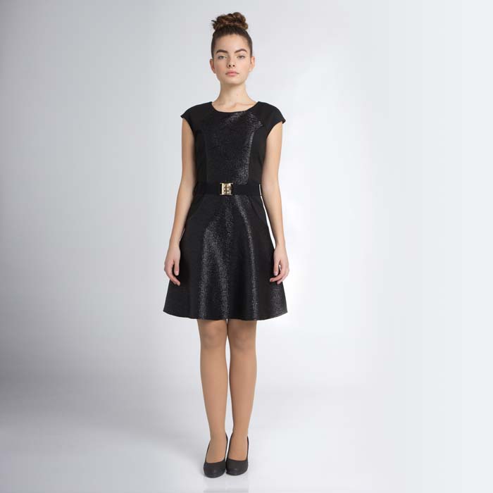 Платье для девочки из трикотажного материала чёрного цвета . Силуэт расширенный. Отрезное по линии бёдер. Длиной выше линии колена на 7см. На полочке и спинке рельефы. Вставки платья из трикотажного материала. На спинке застёжка молния.