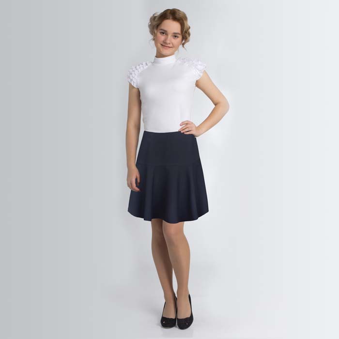 Юбка для девочки из трикотажного джерси тёмно-синего цвета. Силуэт расширенный. Посадка стандартная. Длина ниже середины бедра на 5-6см. Сзади застёжка на потайную молнию. По поясу надней половинки проложена регулируемая резинка