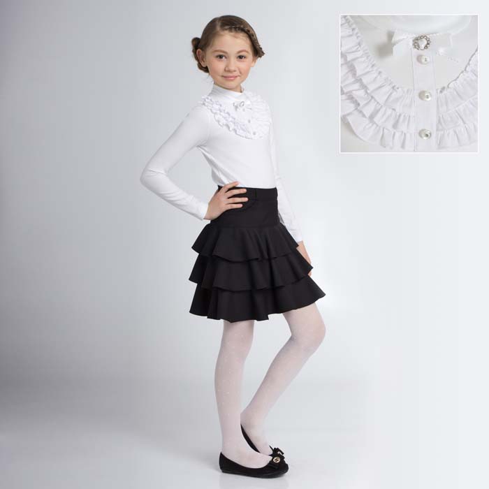 Блуза для девочки из трикотажной кулирки белого цвета. Длина стандартная. Силуэт REGULAR. Полочка декорированна рюшами из текстиля. На спинке застёжка на пуговицу