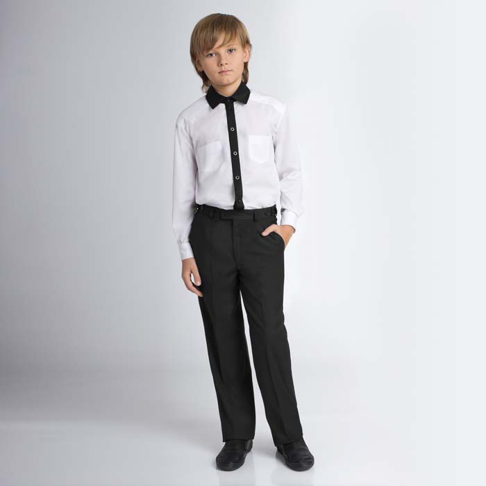 Брюки для мальчика из текстиля чёрного цвета. Силуэт REGULAR. Посадка стандартная. На задних половинках вытачки и прорезные карманы с листочкой. На передних половинках боковые карманы.