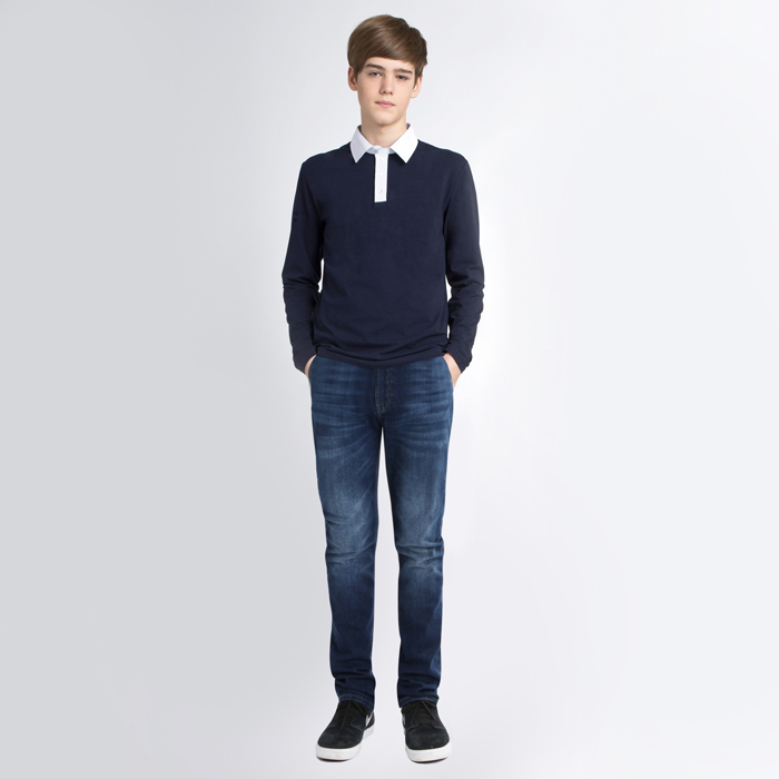 Джемпер-обманка для мальчика из трикотажной кулирки тёмно-синего цвета. Длина стандартная. Силуэт REGULAR. Застёжка планка полочек на пуговицы. Воротник, планка полочки, нижняя часть спинки из текстиля контрастного цвета. Спинка длиннее полочки. Принт полочки выполнен экокрасками