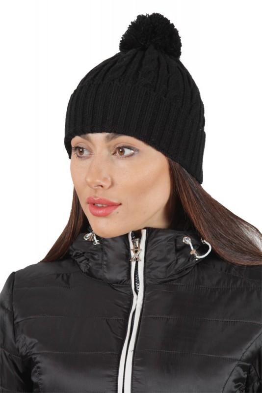 Шапка с узором в виде косичек крупной вязки. Декорирована фирменной фурнитурой.