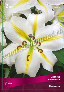 Легенда- высота растения 100см, цветок белый с желтой полосой по центру лепестка и зеленцой у основания.