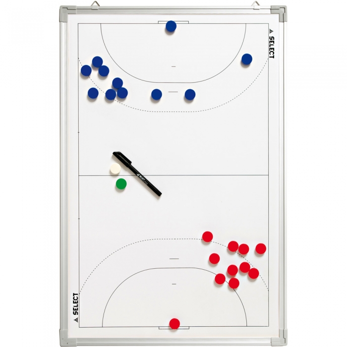 Тактические гандбольная доска Se**lect Handball. В комплекте: доска с разметкой поля из металлического сплава, разноцветные магнитные фишки, маркер. Размер доски: 60 х 90 см. Материалы: металл, пластик, магнит.