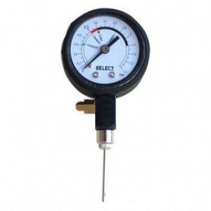 Манометр механический Sel**ect для измерения давления в мячах. Шкала показаний в барах. Никелевый сплав, обрезиненный пластик, длина 10 см, ширина 4 см, высота 2,5 см, клапан для выпуска лишнего воздуха, игла лиаметром 2 мм входит в комплект, наклейка на манометре с рекомендуемыми величинами давлений в мячах для различных видов спорта.