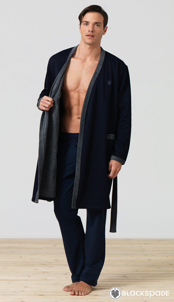 Теплый 2-ух слойный мужской халат на запах с накладными карманами, верхний слой которого из гладкого трикотажа, внутренний из ворсистого флиса.