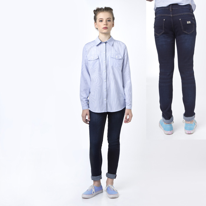 Джинсы для девочки тёмно-синего цвета.Силуэт Slim.Длина Стандартная.Спереди изделия два кармана с часовым.Сзади изделия два накладных кармана c хольнитенами.Застёжки-пуговицы.На поясе изделия шлёвки для ремня.Брючины изделия с подворотом.