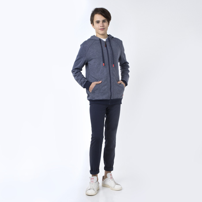 Жакет для мальчика из трикотажного футора цвета индиго. Внутренняя часть капюшона из отделочного трикотажного материала(кулирка) контрастного цвета. Капюшон с шнуром , люверсами . Центральная бортовая застежка- молния. На нижней полочке два боковых кармана.Притачной пояс и манжеты по низу рукава из отделочного трикотажного материала контрасного цвета.Длина Стандартная. Силуэт REGULAR.