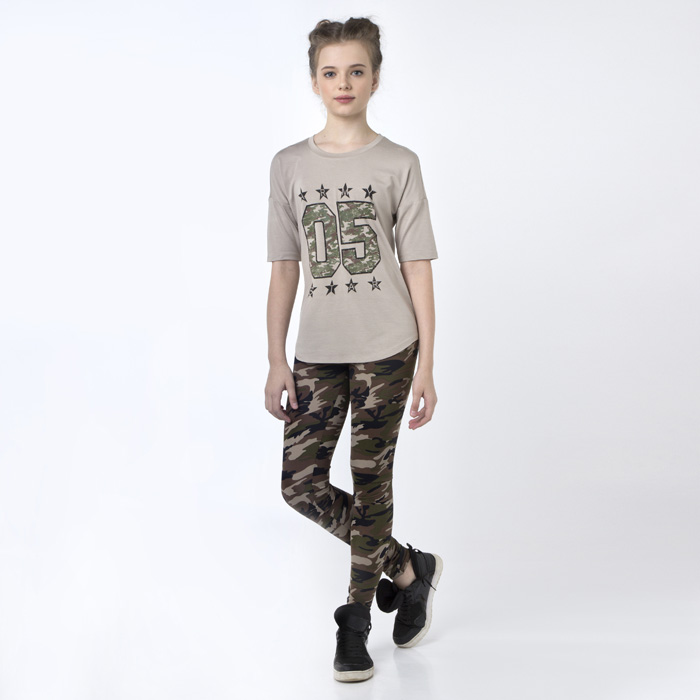 Блуза для девочки из трикотажного полотна бежевого цвета. Силуэт Comfort. На полочке выполнен принт экокрасками.Спущенная линия плеча.