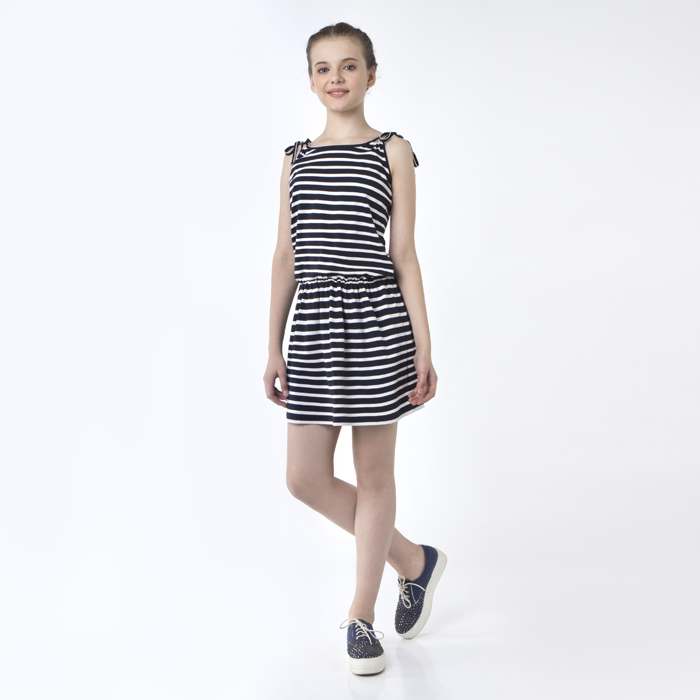 Платье для девочки из трикотажного материала цвета белая полоска. Длина На 10 см выше колена.Силуэт Regular.В пояс изделия продета резинка.