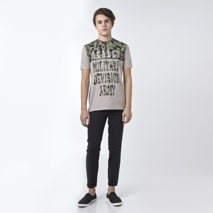 Футболка для мальчика из трикотажного полотна бежевого цвета.Силуэт Regular.На полочке и на спинке выполнен принт экокрасками. Горловина изделия выполнена из отделочного трикотажного материала контрасного цвета.