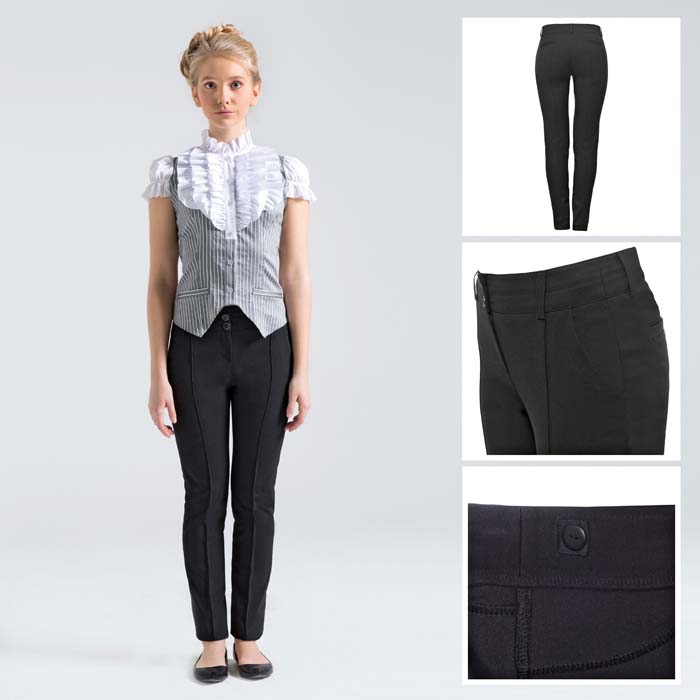 Брюки для девочки из текстиля чёрного цвета.Силуэт SLIM.Длина в пол.Посадка стандартная. На передней половинке боковые карманы с листочкой и застёжка молния. На задних половинках прорезные карманы. В пояс проложена резинка