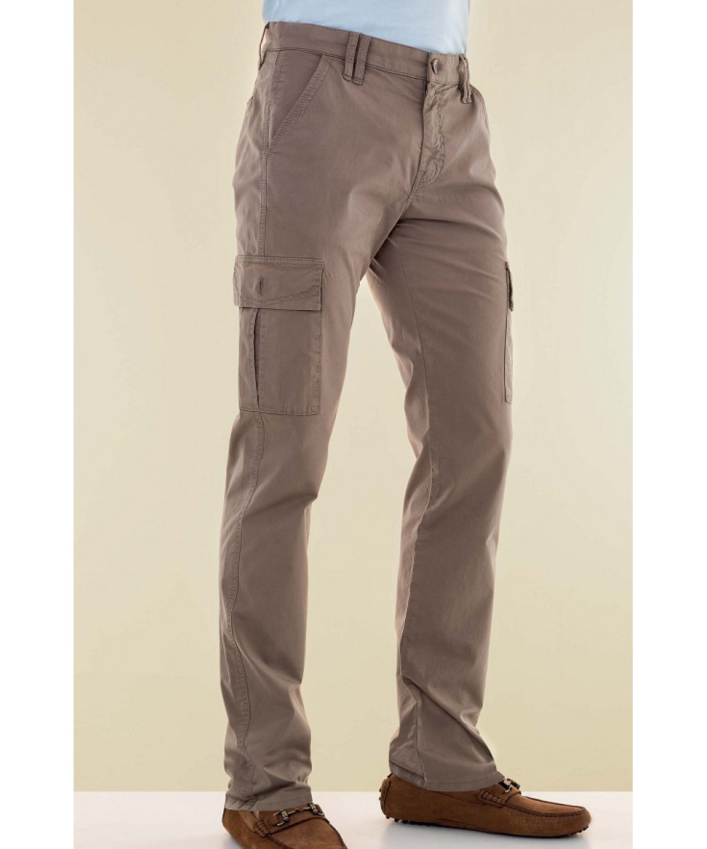 Актуальные брюки в спортивном стиле удобного прямого кроя. Модель застегивается на молнию и пуговицу. Имеются функциональные карманы: боковые, прорезные на пуговице сзади и накладные с клапанами на брючинах. Брюки со шлевками для ремня.
