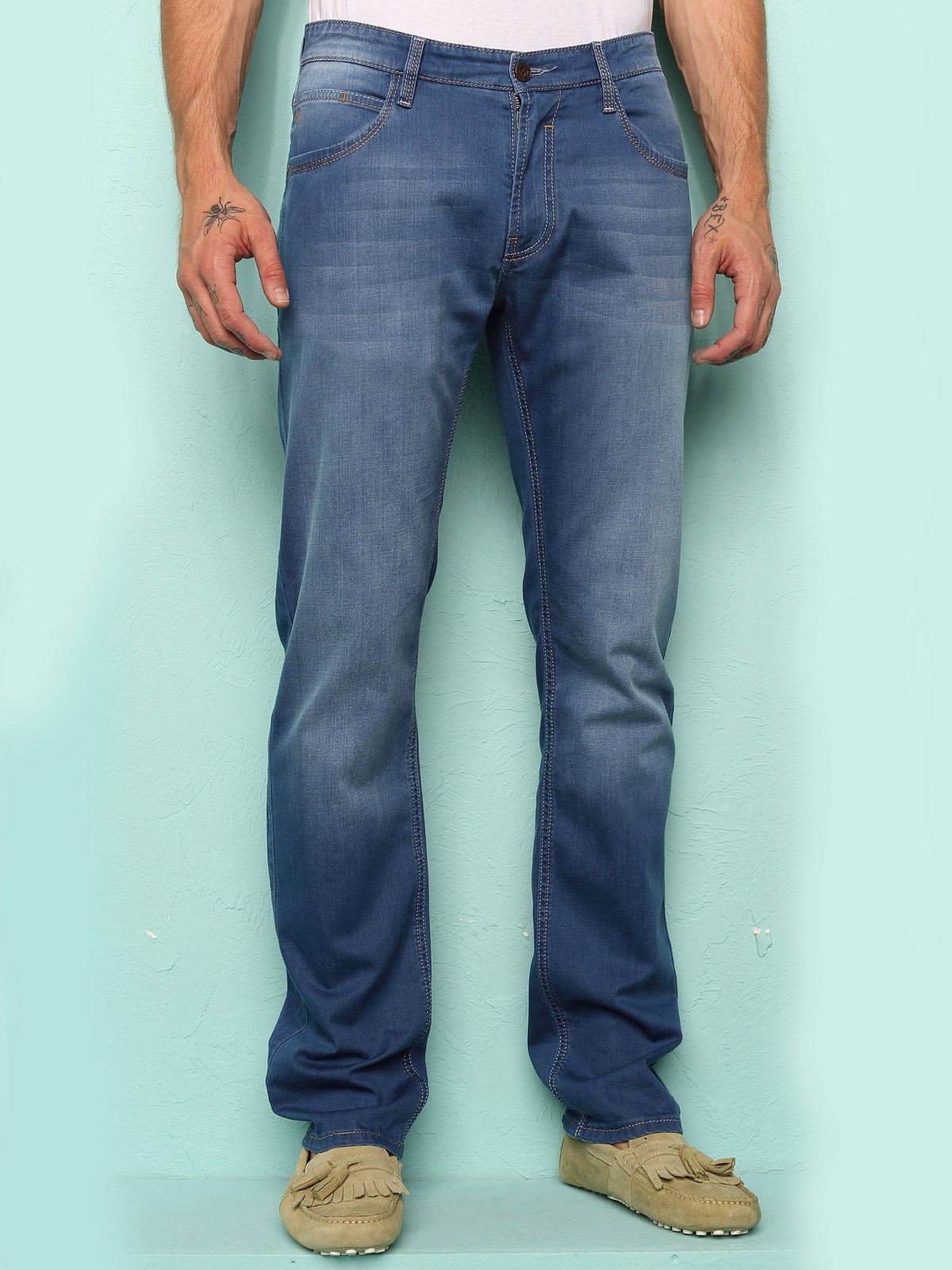 Стильные джинсы с модным эффектом потертости ткани. Пять карманов. Сзади на поясе модель украшает кожаная вставка.