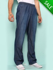 Удобные джинсы на поясе с широкой эластичной резинкой. По бокам и сзади имеются прорезные карманы, застегивающиеся на молнию. Модный эффект потертости денима.