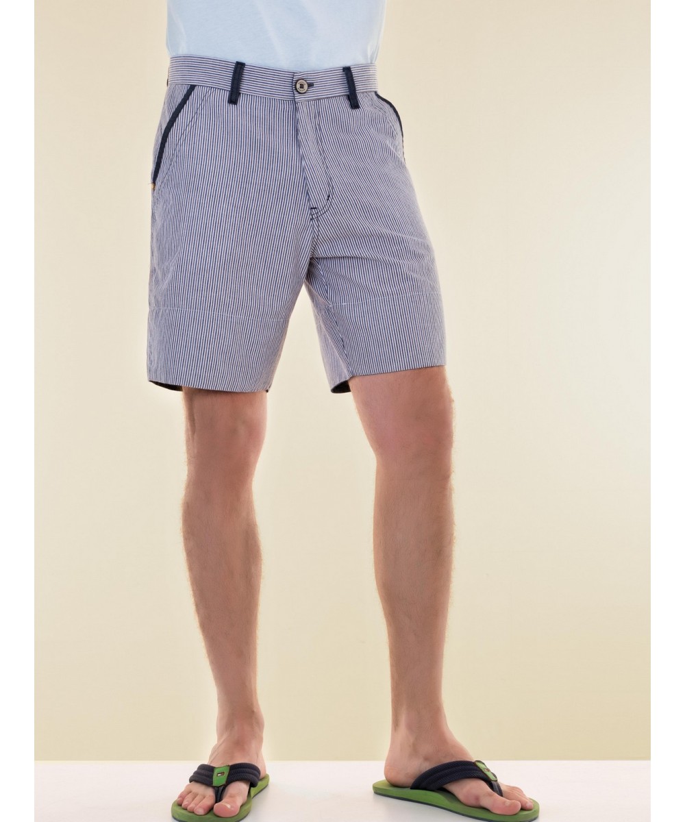 Оригинальная модель в мелкую полоску. Шлевки для ремня и окантовка боковых карманов выполнены на контрасте. Шорты застегиваются на молнию и металлизированную пуговицу с гравировкой.