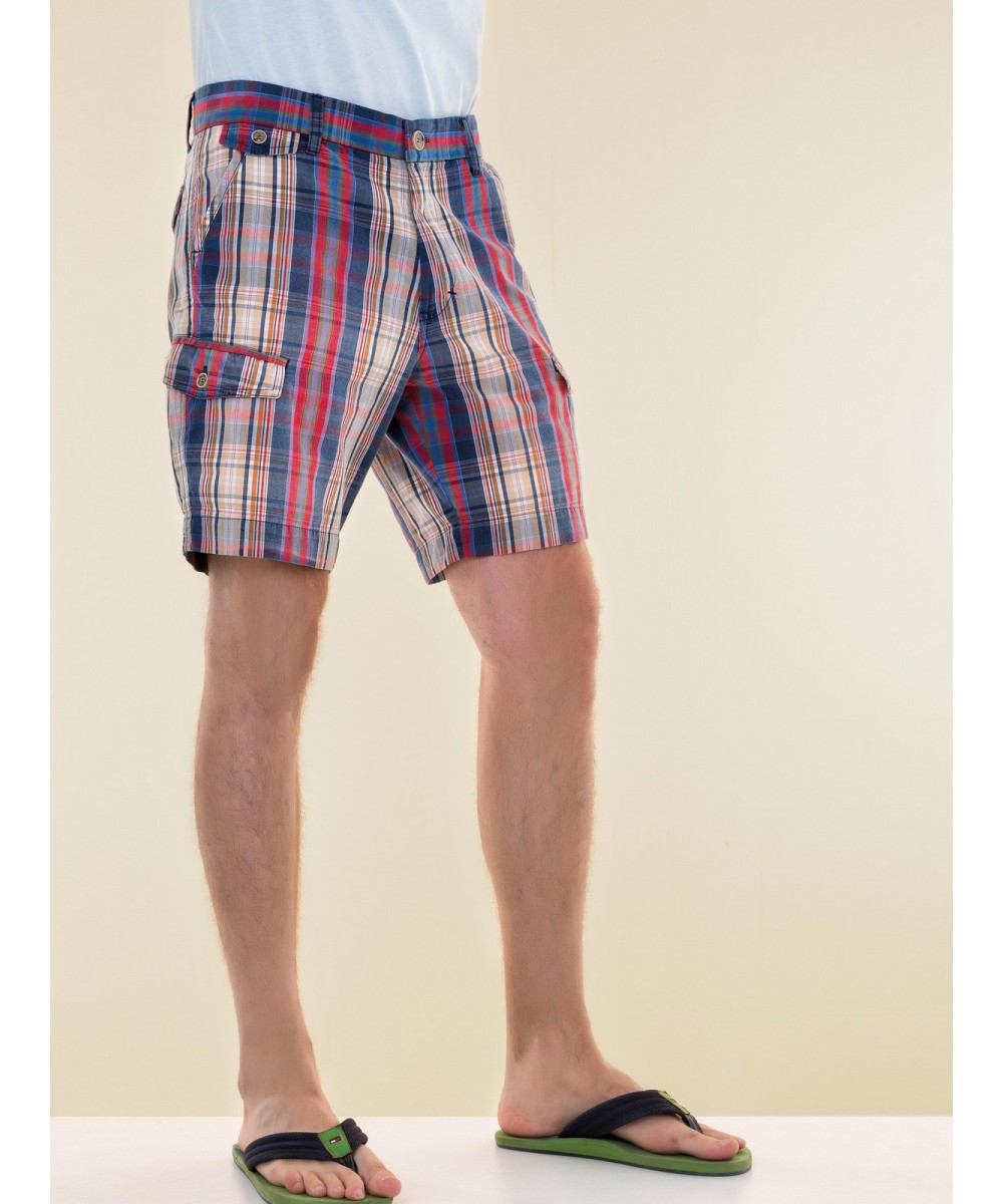 Стильные шорты прямого кроя. Модель в яркую клетку спереди застегивается на молнию и пуговицу. Имеются удобные карманы сзади, по бокам и на брючинах. На поясе есть шлевки для ремня.