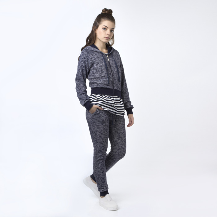 Брюки для девочки из трикотажного футера цвета синий меланж. В пояс изделия и низ брючин продета резинка, также в пояс продет шнур с наконечниками. Пояс изделия инз брючин из отделочного трикотажного материала. На изделии два кармана.Длина Стандартная. Силуэт Comfort зауженные к низу. Посадка Стандартная.