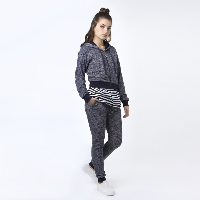 Жакет для девочки из трикотажного материала цвета синий меланж.Центральная бортовая застёжка-молния.Низ изделия и манжеты по низу рукава из отделочного трикотажного материала.В капюшон изделия продет шнур с люверсами и наконечниками.Длина До талии.Силуэт Прямой.Внутренняя часть капюшона из отделочного трикотажного материала контрасного цвета.