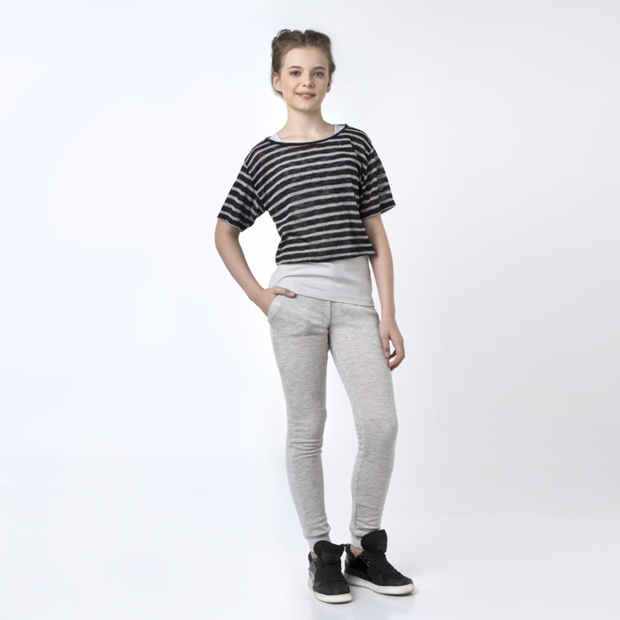 Блуза для девочки из трикотажного материала цвета чёрная полоска.Сиуэт Comfort.Спущенная линия плеча.