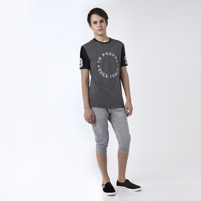 Бриджи для мальчика из трикотажного футера цветом серый меланж. Силуэт Comfort. Посадка Стандартная. Пояс и низ изделия из отделочного трикотажного материала. В пояс изделия продета резинка и шнур с наконечниками.Спереди два кармана.