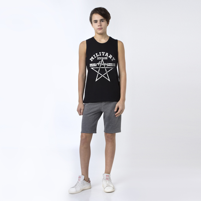 Шорты для мальчика из трикотажного футера цвета серый меланж.Спереди изделия два кармана.Силуэт Comfort.Посадка Стандартная.В пояс изделия продета резинка,шнур с наконечниками.