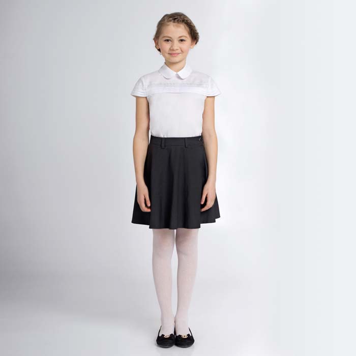 Юбка для девочки из текстиля чёрного цвета. Силуэт расширенный. Длина на 7см выше линии колена. Потайная застёжка молния по боку. На передней и задней половинке юбки рельефные швы.