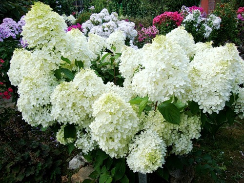 Гортензия метельчатая - кустарник высотой до 2 м. Крона широко раскидистая. Листва темно-зеленая. Цветки собраны в соцветия-метёлки длиной до 30 см, сначала белые, а со временем розовеют, образуются на побегах текущего года. Для обильного цветения рекомендуется проводить ежегодную весеннюю обрезку до начала вегетации. Светолюбива, но может расти и в полутени. Нуждается во влажной и плодородной почве. Лучше растет на кислых почвах. Зимостойка (до -25?С).