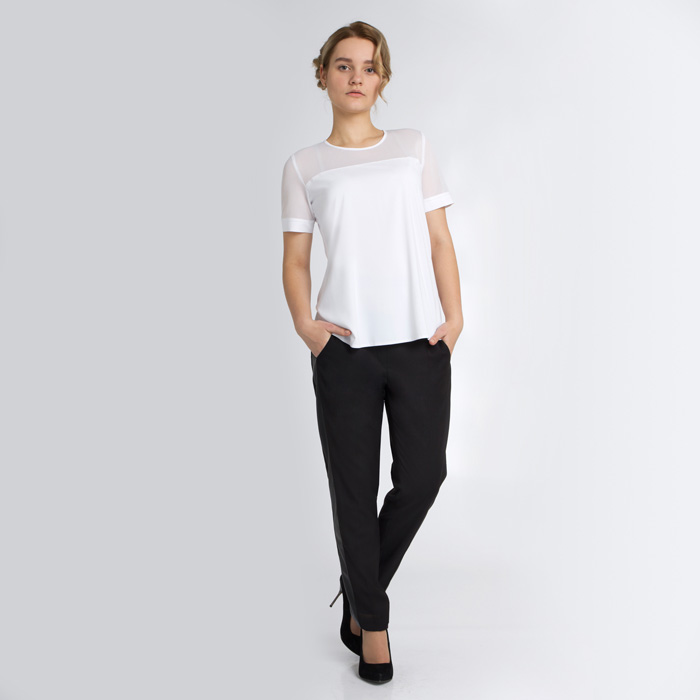 Блуза для девочки из искусственного шёлка белого цвета на подкладке из 100% хлопка в виде топа. Длина стандартная. Силуэт прямой. Кокетки полочки и спинки, рукава из трикотажной сетки.На спинке застёжка-пуговица.Длина Стандартная.Силуэт Прямой.
